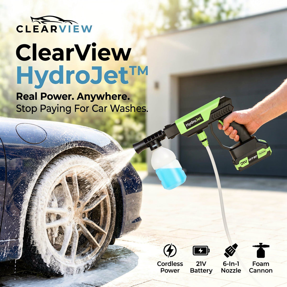 Most drivers rely on weak hoses or expensive car washes. The ClearView HydroJet™ delivers concentrated 1,000 PSI pressure and thick snow foam to lift dirt, brake dust, salt, and mud — right from your driveway.